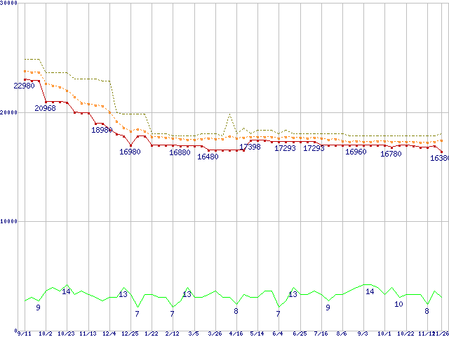 WD1500HLFS (150.0GB)の価格推移↑前グラフ↓次グラフ(2008年9月11日〜2009年11月26日)※このグラフは過去のデータも税率5%相当に調整した税込み相当額のグラフです。 税率変更や、総額表示方式導入(2004年4月)の影響は除いています。●関連グラフHDD/SSD主要製品の最安値推移HDD/SSD主要製品(最安値1万5千円〜2万円未満)の最安値推移HDD 100〜160GB未満の最安値推移WD VelociRaptor (10000rpm,3Gb/s,16MB)の最安値推移●凡例最安値(点線部は販売店未確認または未調査)平均値最高値ショップ数