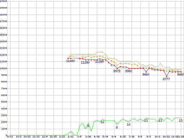 HD154UI (1.5TB,32MB)の価格推移↑前グラフ↓次グラフ(2008年9月11日〜2009年11月26日)※このグラフは過去のデータも税率5%相当に調整した税込み相当額のグラフです。 税率変更や、総額表示方式導入(2004年4月)の影響は除いています。●関連グラフHDD/SSD主要製品の最安値推移HDD/SSD主要製品(最安値1万円未満)の最安値推移HDD 1.5TB〜2TB未満の最安値推移EcoGreen F2 (5400rpm,3Gb/s)の最安値推移●凡例最安値(点線部は販売店未確認または未調査)平均値最高値ショップ数