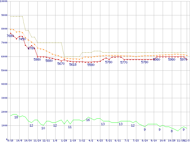 WD6400AAKS (640GB)の価格推移↑前グラフ↓次グラフ(2008年9月18日〜2009年12月3日)※このグラフは過去のデータも税率5%相当に調整した税込み相当額のグラフです。 税率変更や、総額表示方式導入(2004年4月)の影響は除いています。●関連グラフHDD/SSD主要製品の最安値推移HDD/SSD主要製品(最安値1万円未満)の最安値推移HDD 600〜750GB未満の最安値推移WD Caviar Blue (7200rpm,3Gb/s,16MB)の最安値推移●凡例最安値(点線部は販売店未確認または未調査)平均値最高値ショップ数