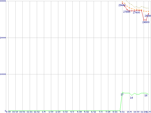Core i7-860 (2.80GHz)の価格推移↑前グラフ↓次グラフ(2008年9月19日〜2009年12月4日)※このグラフは過去のデータも税率5%相当に調整した税込み相当額のグラフです。 税率変更や、総額表示方式導入(2004年4月)の影響は除いています。●関連グラフCPU主要製品の最安値推移CPU主要製品(最安値2万円〜3万円未満)の最安値推移Intel系CPUの最安値推移LGA1156 (L3キャッシュ8MB,Quad Core,Hyper-Threading,TDP 95W)の最安値推移●凡例最安値(点線部は販売店未確認または未調査)平均値最高値ショップ数