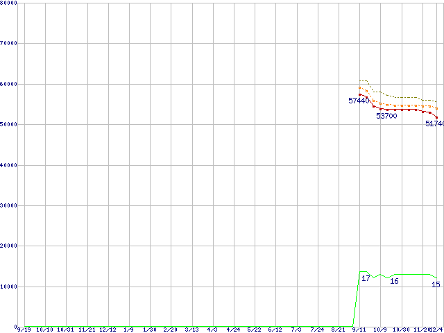 Core i7-870 (2.93GHz)の価格推移↑前グラフ↓次グラフ(2008年9月19日〜2009年12月4日)※このグラフは過去のデータも税率5%相当に調整した税込み相当額のグラフです。 税率変更や、総額表示方式導入(2004年4月)の影響は除いています。●関連グラフCPU主要製品の最安値推移CPU主要製品(最安値3万円〜6万円未満)の最安値推移Intel系CPUの最安値推移LGA1156 (L3キャッシュ8MB,Quad Core,Hyper-Threading,TDP 95W)の最安値推移●凡例最安値(点線部は販売店未確認または未調査)平均値最高値ショップ数