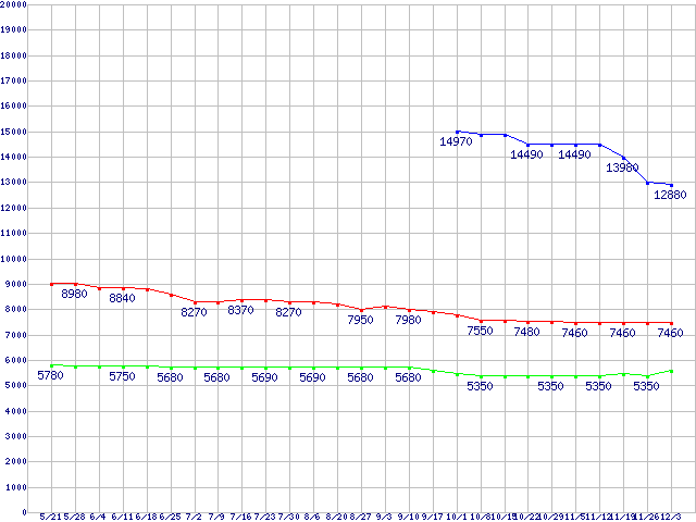 | WD Scorpio Blue (5200〜5400rpm,3Gb/s,2.5インチ)の最安値推移 |