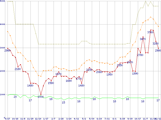 PC2-6400 2GBの価格推移↑前グラフ↓次グラフ(2008年9月27日〜2009年12月12日)※このグラフは過去のデータも税率5%相当に調整した税込み相当額のグラフです。 税率変更や、総額表示方式導入(2004年4月)の影響は除いています。●関連グラフメモリ主要製品の最安値推移2GBモジュール/1GBモジュール×2枚の最安値推移メモリ主要製品(最安値5千円未満)の最安値推移PC2-6400(DDR2-800) DDR2 SDRAM DIMMの最安値推移●凡例最安値(点線部は販売店未確認または未調査)平均値最高値ショップ数