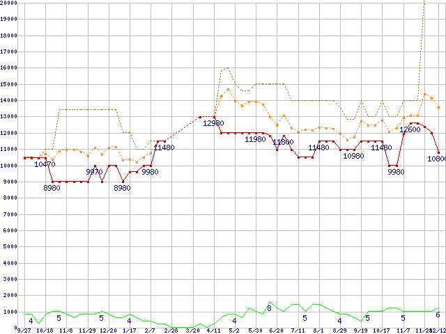 PC2-6400 4GBの価格推移↑前グラフ(2008年9月27日〜2009年12月12日)※このグラフは過去のデータも税率5%相当に調整した税込み相当額のグラフです。 税率変更や、総額表示方式導入(2004年4月)の影響は除いています。●関連グラフメモリ主要製品の最安値推移4GBモジュール/2GBモジュール×2枚の最安値推移メモリ主要製品(最安値1万円以上)の最安値推移PC2-6400(DDR2-800) DDR2 SDRAM DIMMの最安値推移●凡例最安値(点線部は販売店未確認または未調査)平均値最高値ショップ数