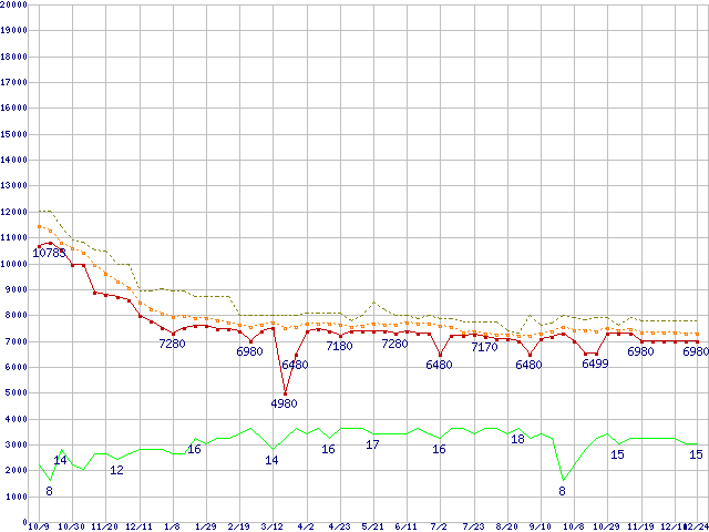 WD10EADS (1TB,32MB)の価格推移↑前グラフ↓次グラフ(2008年10月9日〜2009年12月24日)※このグラフは過去のデータも税率5%相当に調整した税込み相当額のグラフです。 税率変更や、総額表示方式導入(2004年4月)の影響は除いています。●関連グラフHDD/SSD主要製品の最安値推移HDD/SSD主要製品(最安値1万円未満)の最安値推移HDD 1TB〜1.5TB未満の最安値推移WD Caviar Green (3Gb/s)の最安値推移●凡例最安値(点線部は販売店未確認または未調査)平均値最高値ショップ数