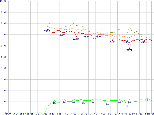 HD103SI (1TB,32MB)の価格推移↑前グラフ↓次グラフ(2008年10月9日〜2009年12月24日)※このグラフは過去のデータも税率5%相当に調整した税込み相当額のグラフです。 税率変更や、総額表示方式導入(2004年4月)の影響は除いています。●関連グラフHDD/SSD主要製品の最安値推移HDD/SSD主要製品(最安値1万円未満)の最安値推移HDD 1TB〜1.5TB未満の最安値推移EcoGreen F2 (5400rpm,3Gb/s)の最安値推移●凡例最安値(点線部は販売店未確認または未調査)平均値最高値ショップ数
