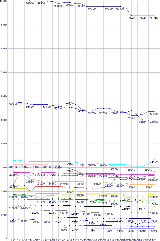 Intel系CPUの最安値推移↑前グラフ↓次グラフ(2009年6月26日〜2010年1月8日)※このグラフは過去のデータも税率5%相当に調整した税込み相当額のグラフです。 税率変更や、総額表示方式導入(2004年4月)の影響は除いています。凡例Core i7-975 Extreme Edition (3.33GHz)Core i7-950 (3.06GHz)Core i7-870 (2.93GHz)Core i7-860S (2.53GHz)Core 2 Quad Q9550S (2.83GHz,L2 6MB×2)Core 2 Quad Q9650 (3.00GHz,L2 6MB×2)Core i5-670 (3.46GHz)Core i7-920 (2.66GHz)Core i7-860 (2.80GHz)Core i5-750S (2.4GHz)Core 2 Quad Q9550 (2.83GHz,L2 6MB×2)Core 2 Duo E8600 (3.33GHz,L2 6MB)Core 2 Quad Q9400S (2.66GHz,L2 3MB×2)Core i5-661 (3.33GHz)Core i5-660 (3.33GHz)Core i5-750 (2.66GHz)Core 2 Quad Q9400 (2.66GHz,L2 3MB×2)Core i5-650 (3.2GHz)Core 2 Duo E8500 (3.16GHz,L2 6MB)Core 2 Quad Q8400 (2.66GHz,L2 2MB×2)Core 2 Duo E8400 (3GHz,L2 6MB)Core i3-540 (3.06GHz)Core 2 Duo E7600 (3.06GHz,L2 3MB)Core i3-530 (2.93GHz)Core 2 Duo E7500 (2.93GHz,L2 3MB)Pentium G6950 (2.8GHz)Pentium Dual-Core E6500 (2.93GHz,L2 2MB)Pentium Dual-Core E6300 (2.8GHz,L2 2MB)Celeron E3300 (2.5GHz)Celeron E3200 (2.4GHz)※製品名をクリックすると個別のグラフを表示します※点線部は販売店が確認できなかった、または調査データがないことを示します