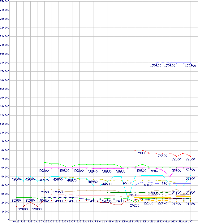 HDD/SSD主要製品(最安値2万円以上)の最安値推移↑前グラフ(2009年6月25日〜2010年1月7日)※このグラフは過去のデータも税率5%相当に調整した税込み相当額のグラフです。 税率変更や、総額表示方式導入(2004年4月)の影響は除いています。凡例2.5インチSSD(東芝製コントローラ) 512GB (512GB,MLC)2.5インチSSD(東芝製コントローラ) 256GB (256GB,MLC)2.5インチSSD(SAMSUNG製コントローラ) 256GB (256GB,MLC)2.5インチSSD(INDILINX製コントローラ) 256GB (256GB,MLC)2.5インチSSD 256GB (256GB,MLC)SDSA2MH160G2C1/R1/R5 (160GB,MLC)2.5インチSSD(東芝製コントローラ) 128GB (128GB,MLC)2.5インチSSD(SAMSUNG製コントローラ) 128GB (128GB,MLC)WD2001FASS (2TB,64MB)2.5インチSSD(INDILINX製コントローラ) 128GB (128GB,MLC)ST32000641AS (2TB,64MB)2.5インチSSD(JMicron JMF612搭載) 128GB (128GB,MLC)SDSA2MH80G2C1/R1/R5 (80GB,MLC)2.5インチSSD 128GB (128GB,MLC)WD3000HLFS (300.0GB)X25-M(G2)OEM品SSD (80GB,MLC)2.5インチSSD(東芝製コントローラ) 64GB (64GB,MLC)※製品名をクリックすると個別のグラフを表示します※点線部は販売店が確認できなかった、または調査データがないことを示します