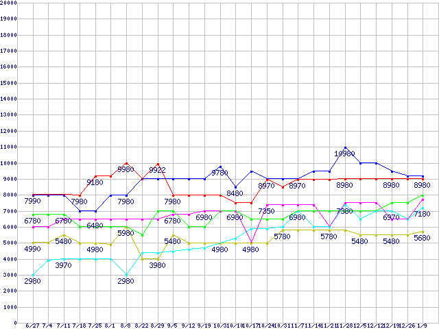 | メモリ主要製品(最安値5千円〜1万円未満)の最安値推移 |