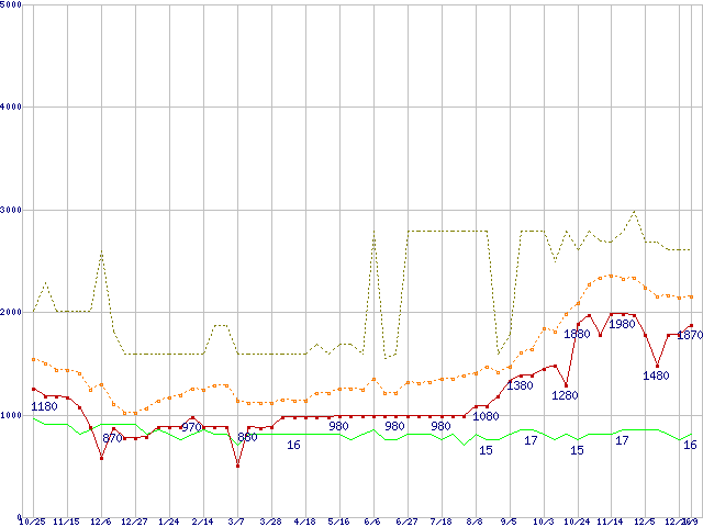 PC2-6400 1GBの価格推移↑前グラフ↓次グラフ(2008年10月25日〜2010年1月9日)※このグラフは過去のデータも税率5%相当に調整した税込み相当額のグラフです。 税率変更や、総額表示方式導入(2004年4月)の影響は除いています。●関連グラフメモリ主要製品の最安値推移1GBモジュールの最安値推移メモリ主要製品(最安値5千円未満)の最安値推移PC2-6400(DDR2-800) DDR2 SDRAM DIMMの最安値推移●凡例最安値(点線部は販売店未確認または未調査)平均値最高値ショップ数