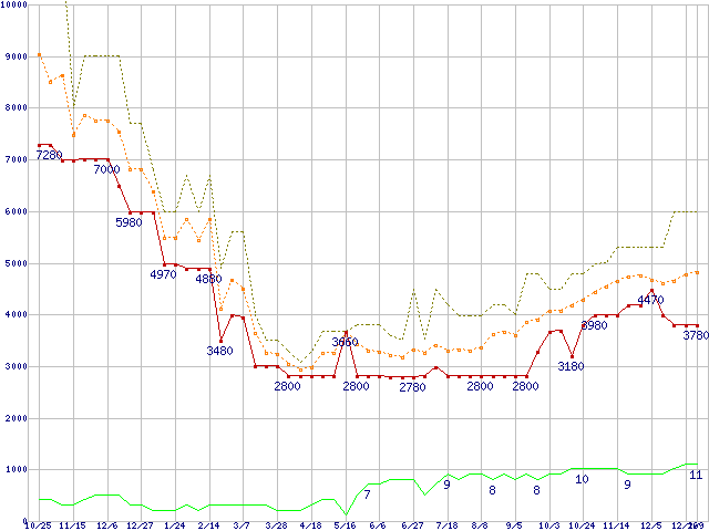 PC3-10600 2GBの価格推移↑前グラフ↓次グラフ(2008年10月25日〜2010年1月9日)※このグラフは過去のデータも税率5%相当に調整した税込み相当額のグラフです。 税率変更や、総額表示方式導入(2004年4月)の影響は除いています。●関連グラフメモリ主要製品の最安値推移2GBモジュール/1GBモジュール×2枚の最安値推移メモリ主要製品(最安値5千円未満)の最安値推移PC3-10600(DDR3-1333) DDR3 SDRAM DIMMの最安値推移●凡例最安値(点線部は販売店未確認または未調査)平均値最高値ショップ数