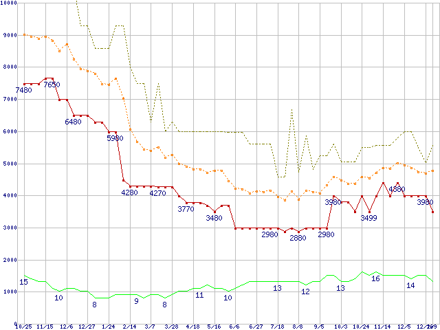 PC3-10600 1GB×2枚組みセットの価格推移↑前グラフ↓次グラフ(2008年10月25日〜2010年1月9日)※このグラフは過去のデータも税率5%相当に調整した税込み相当額のグラフです。 税率変更や、総額表示方式導入(2004年4月)の影響は除いています。●関連グラフメモリ主要製品の最安値推移2GBモジュール/1GBモジュール×2枚の最安値推移メモリ主要製品(最安値5千円未満)の最安値推移PC3-10600(DDR3-1333) DDR3 SDRAM DIMMの最安値推移PC3-10600/PC2-6400 1GB×2枚組みセットの最安値推移●凡例最安値(点線部は販売店未確認または未調査)平均値最高値ショップ数