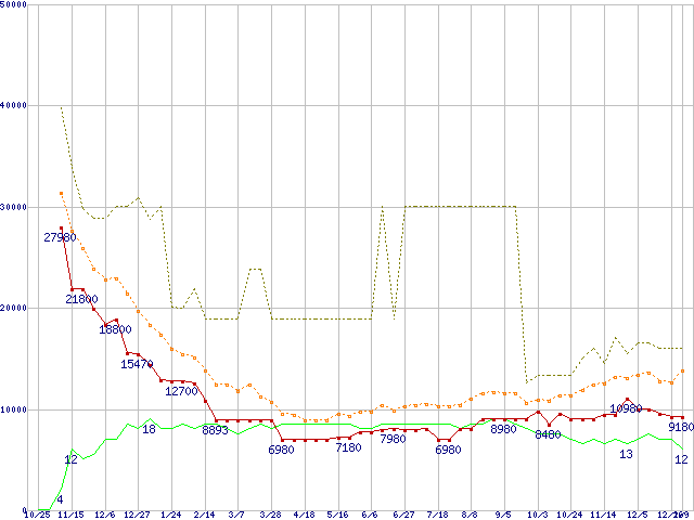 PC3-10600 2GB×3枚組みセットの価格推移↑前グラフ↓次グラフ(2008年10月25日〜2010年1月9日)※このグラフは過去のデータも税率5%相当に調整した税込み相当額のグラフです。 税率変更や、総額表示方式導入(2004年4月)の影響は除いています。●関連グラフメモリ主要製品の最安値推移メモリ主要製品(最安値5千円〜1万円未満)の最安値推移PC3-10600(DDR3-1333) DDR3 SDRAM DIMMの最安値推移●凡例最安値(点線部は販売店未確認または未調査)平均値最高値ショップ数