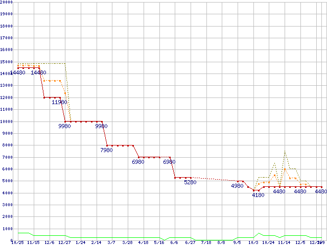 PC3-12800 2GBの価格推移↑前グラフ↓次グラフ(2008年10月25日〜2010年1月9日)※このグラフは過去のデータも税率5%相当に調整した税込み相当額のグラフです。 税率変更や、総額表示方式導入(2004年4月)の影響は除いています。●関連グラフメモリ主要製品の最安値推移2GBモジュール/1GBモジュール×2枚の最安値推移メモリ主要製品(最安値5千円未満)の最安値推移PC3-12800(DDR3-1600) DDR3 SDRAM DIMMの最安値推移●凡例最安値(点線部は販売店未確認または未調査)平均値最高値ショップ数