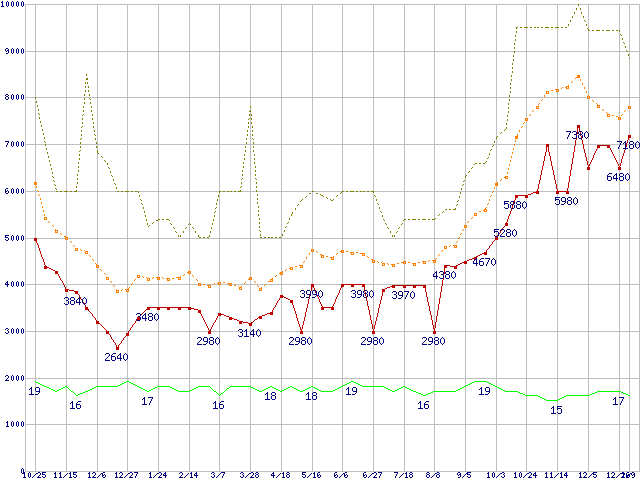 PC2-6400 2GB×2枚組みセットの価格推移↑前グラフ↓次グラフ(2008年10月25日〜2010年1月9日)※このグラフは過去のデータも税率5%相当に調整した税込み相当額のグラフです。 税率変更や、総額表示方式導入(2004年4月)の影響は除いています。●関連グラフメモリ主要製品の最安値推移4GBモジュール/2GBモジュール×2枚の最安値推移メモリ主要製品(最安値5千円〜1万円未満)の最安値推移PC2-6400(DDR2-800) DDR2 SDRAM DIMMの最安値推移●凡例最安値(点線部は販売店未確認または未調査)平均値最高値ショップ数