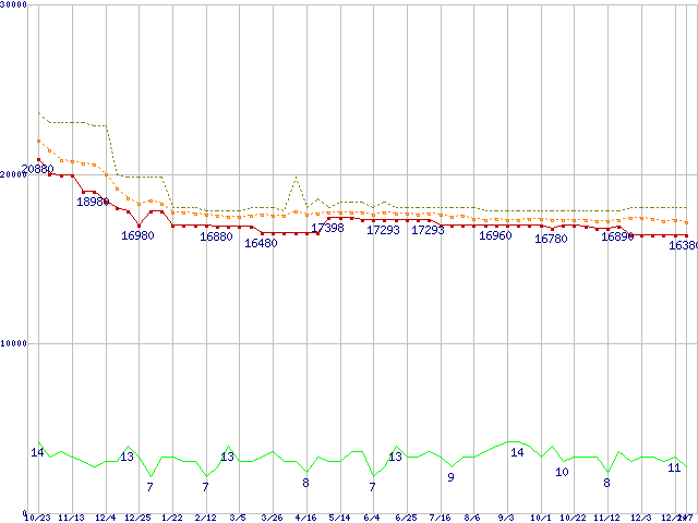 WD1500HLFS (150.0GB)の価格推移↑前グラフ↓次グラフ(2008年10月23日〜2010年1月7日)※このグラフは過去のデータも税率5%相当に調整した税込み相当額のグラフです。 税率変更や、総額表示方式導入(2004年4月)の影響は除いています。●関連グラフHDD/SSD主要製品の最安値推移HDD/SSD主要製品(最安値1万5千円〜2万円未満)の最安値推移HDD 100〜160GB未満の最安値推移WD VelociRaptor (10000rpm,3Gb/s,16MB)の最安値推移●凡例最安値(点線部は販売店未確認または未調査)平均値最高値ショップ数