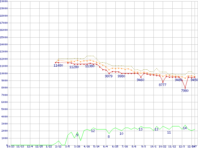 HD154UI (1.5TB,32MB)の価格推移↑前グラフ↓次グラフ(2008年10月23日〜2010年1月7日)※このグラフは過去のデータも税率5%相当に調整した税込み相当額のグラフです。 税率変更や、総額表示方式導入(2004年4月)の影響は除いています。●関連グラフHDD/SSD主要製品の最安値推移HDD/SSD主要製品(最安値1万円未満)の最安値推移HDD 1.5TB〜2TB未満の最安値推移EcoGreen F2 (5400rpm,3Gb/s)の最安値推移●凡例最安値(点線部は販売店未確認または未調査)平均値最高値ショップ数
