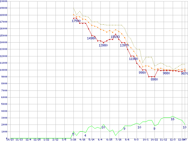 WD15EADS (1.5TB,32MB)の価格推移↑前グラフ↓次グラフ(2008年10月23日〜2010年1月7日)※このグラフは過去のデータも税率5%相当に調整した税込み相当額のグラフです。 税率変更や、総額表示方式導入(2004年4月)の影響は除いています。●関連グラフHDD/SSD主要製品の最安値推移HDD/SSD主要製品(最安値1万円未満)の最安値推移HDD 1.5TB〜2TB未満の最安値推移WD Caviar Green (3Gb/s)の最安値推移●凡例最安値(点線部は販売店未確認または未調査)平均値最高値ショップ数