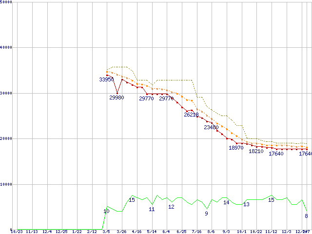 WD20EADS (2TB,32MB)の価格推移↑前グラフ(2008年10月23日〜2010年1月7日)※このグラフは過去のデータも税率5%相当に調整した税込み相当額のグラフです。 税率変更や、総額表示方式導入(2004年4月)の影響は除いています。●関連グラフHDD/SSD主要製品の最安値推移HDD/SSD主要製品(最安値1万5千円〜2万円未満)の最安値推移HDD 2TB以上の最安値推移WD Caviar Green (3Gb/s)の最安値推移●凡例最安値(点線部は販売店未確認または未調査)平均値最高値ショップ数