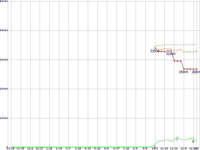 PC2-6400 4GB×2枚組みセットの価格推移↑前グラフ↓次グラフ(2008年10月25日〜2010年1月9日)※このグラフは過去のデータも税率5%相当に調整した税込み相当額のグラフです。 税率変更や、総額表示方式導入(2004年4月)の影響は除いています。●関連グラフメモリ主要製品の最安値推移メモリ主要製品(最安値1万円以上)の最安値推移PC2-6400(DDR2-800) DDR2 SDRAM DIMMの最安値推移●凡例最安値(点線部は販売店未確認または未調査)平均値最高値ショップ数