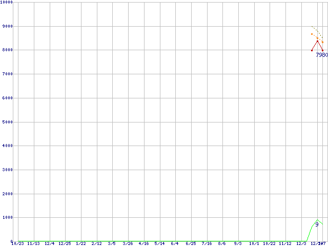 WD10EARS (1TB,64MB)の価格推移↑前グラフ↓次グラフ(2008年10月23日〜2010年1月7日)※このグラフは過去のデータも税率5%相当に調整した税込み相当額のグラフです。 税率変更や、総額表示方式導入(2004年4月)の影響は除いています。●関連グラフHDD/SSD主要製品の最安値推移HDD/SSD主要製品(最安値1万円未満)の最安値推移HDD 1TB〜1.5TB未満の最安値推移WD Caviar Green (3Gb/s)の最安値推移●凡例最安値(点線部は販売店未確認または未調査)平均値最高値ショップ数