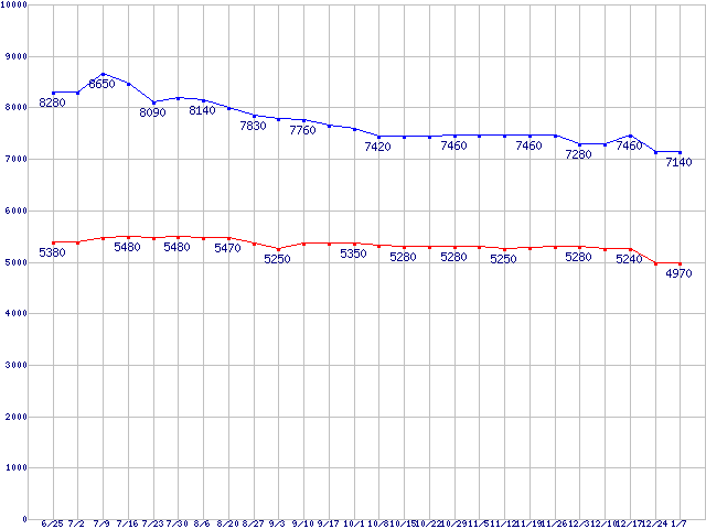 | Travelstar 5K500.B (5400rpm,3Gb/s,2.5インチ)の最安値推移 |