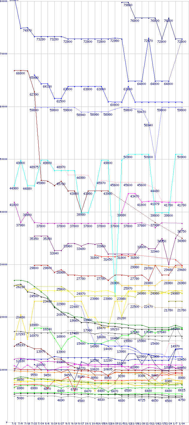 HDD/SSD主要製品の最安値推移↑前グラフ↓次グラフ(2009年7月2日〜2010年1月14日)※このグラフは過去のデータも税率5%相当に調整した税込み相当額のグラフです。 税率変更や、総額表示方式導入(2004年4月)の影響は除いています。凡例2.5インチSSD(東芝製コントローラ) 256GB (256GB,MLC)SSDSA2SH064G1C5 (64GB,SLC)2.5インチSSD(SAMSUNG製コントローラ) 256GB (256GB,MLC)2.5インチSSD(INDILINX製コントローラ) 256GB (256GB,MLC)2.5インチSSD 256GB (256GB,MLC)SDSA2MH160G2C1/R1/R5 (160GB,MLC)2.5インチSSD(東芝製コントローラ) 128GB (128GB,MLC)SSDSA2SH032G1 (32GB,SLC)2.5インチSSD(SAMSUNG製コントローラ) 128GB (128GB,MLC)SSDSA2MH160G1C5 (160GB,MLC)2.5インチSSD(INDILINX製コントローラ) 128GB (128GB,MLC)WD2001FASS (2TB,64MB)ST32000641AS (2TB,64MB)2.5インチSSD(JMicron JMF612搭載) 128GB (128GB,MLC)2.5インチSSD 128GB (128GB,MLC)WD3000HLFS (300.0GB)SDSA2MH80G2C1/R1/R5 (80GB,MLC)X25-M(G2)OEM品SSD (80GB,MLC)2.5インチSSD(東芝製コントローラ) 64GB (64GB,MLC)ST32000542AS (2TB,32MB)WD20EARS (2TB,64MB)2.5インチSSD(INDILINX製コントローラ) 64GB (64GB,MLC)WD20EADS (2TB,32MB)WD1500HLFS (150.0GB)2.5インチSSD(JMicron JMF612搭載) 64GB (64GB,MLC)2.5インチSSD(SAMSUNG製コントローラ) 64GB (64GB,MLC)2.5インチSSD(INDILINX製コントローラ) 32GB (32GB,MLC)2.5インチSSD 64GB (64GB,MLC)WD6400BEVT (640GB,8MB)HDS722020ALA330 (2TB,32MB)SSDSA2MP040G2R5 (40GB,MLC)SNV125-S2・S2BD/40GB (40GB,MLC)ST31500341AS (1.5TB,32MB)ST31500541AS (1.5TB,32MB)WD15EARS (1.5TB,64MB)WD15EADS (1.5TB,32MB)HD154UI (1.5TB,32MB)2.5インチSSD 32GB (32GB,MLC)WD1001FALS (1TB,32MB)WD10EARS (1TB,64MB)ST31000528AS (1TB,32MB)ST31000520AS (1TB,32MB)WD5000BEVT (500GB,8MB)HDS721010CLA332 (1TB,32MB)WD10EADS (1TB,32MB)HTS545050B9A300 (500GB,8MB)HD103SI (1TB,32MB)WD3200BEVT (320GB,8MB)HTS545032B9A300 (320GB,8MB)HDS721050CLA362 (500GB,16MB)ST3500418AS (500GB,16MB)※製品名をクリックすると個別のグラフを表示します※点線部は販売店が確認できなかった、または調査データがないことを示します