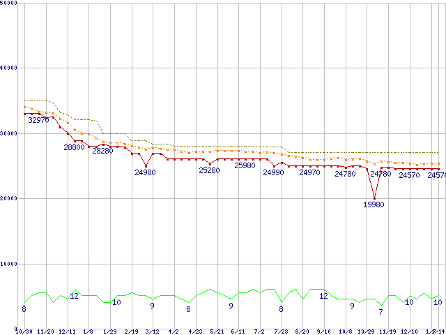WD3000HLFS (300.0GB)の価格推移↑前グラフ↓次グラフ(2008年10月30日〜2010年1月14日)※このグラフは過去のデータも税率5%相当に調整した税込み相当額のグラフです。 税率変更や、総額表示方式導入(2004年4月)の影響は除いています。●関連グラフHDD/SSD主要製品の最安値推移HDD/SSD主要製品(最安値2万円以上)の最安値推移HDD 300〜400GB未満の最安値推移WD VelociRaptor (10000rpm,3Gb/s,16MB)の最安値推移●凡例最安値(点線部は販売店未確認または未調査)平均値最高値ショップ数
