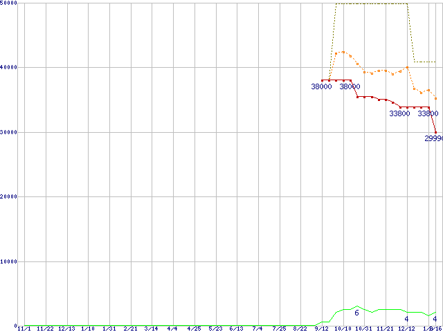 PC3-10600 4GB×2枚組みセットの価格推移↑前グラフ↓次グラフ(2008年11月1日〜2010年1月16日)※このグラフは過去のデータも税率5%相当に調整した税込み相当額のグラフです。 税率変更や、総額表示方式導入(2004年4月)の影響は除いています。●関連グラフメモリ主要製品の最安値推移メモリ主要製品(最安値1万円以上)の最安値推移PC3-10600(DDR3-1333) DDR3 SDRAM DIMMの最安値推移●凡例最安値(点線部は販売店未確認または未調査)平均値最高値ショップ数
