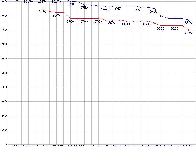 | Socket AM3 (HyperTransport 3.0,Dual Core,L3 6MB,TDP 80W)の最安値推移 |