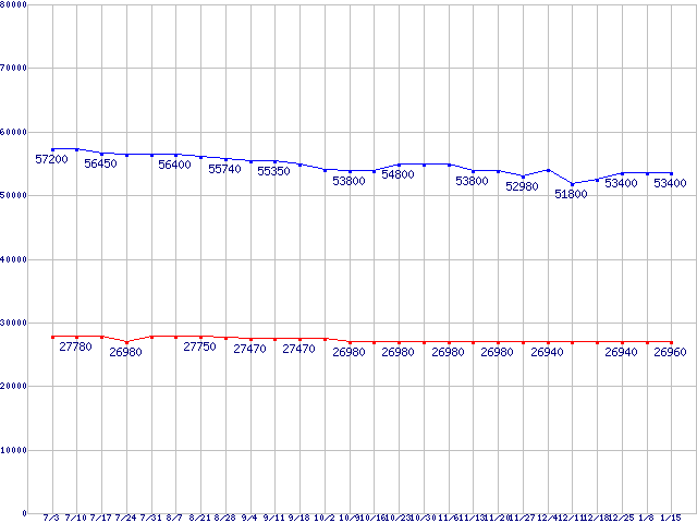 | LGA1366 (QPI 4.8GT/s,L3キャッシュ8MB,Quad Core,Hyper-Threading,TDP 130W)の最安値推移 |
