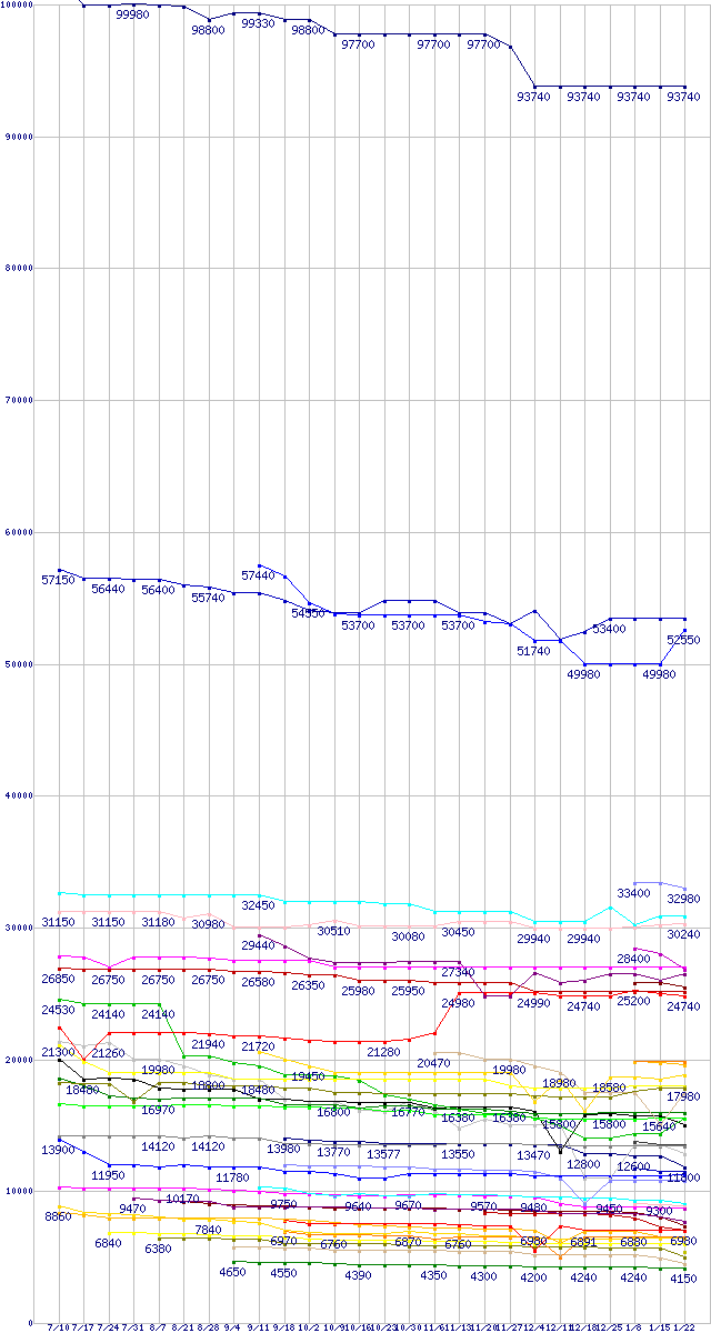 CPU主要製品の最安値推移↑前グラフ↓次グラフ(2009年7月10日〜2010年1月22日)※このグラフは過去のデータも税率5%相当に調整した税込み相当額のグラフです。 税率変更や、総額表示方式導入(2004年4月)の影響は除いています。凡例Core i7-975 Extreme Edition (3.33GHz)Core i7-950 (3.06GHz)Core i7-870 (2.93GHz)Core i7-860S (2.53GHz)Core 2 Quad Q9550S (2.83GHz,L2 6MB×2)Core 2 Quad Q9650 (3.00GHz,L2 6MB×2)Core i7-920 (2.66GHz)Core i5-670 (3.46GHz)Core i7-860 (2.80GHz)Core i5-750S (2.4GHz)Core 2 Duo E8600 (3.33GHz,L2 6MB)Core 2 Quad Q9550 (2.83GHz,L2 6MB×2)Core i5-661 (3.33GHz)Core i5-660 (3.33GHz)Core i5-750 (2.66GHz)Core 2 Quad Q9400 (2.66GHz,L2 3MB×2)Core i5-650 (3.2GHz)Core 2 Duo E8500 (3.16GHz,L2 6MB)Phenom II X4 965 Black Edition (3.4GHz,L2 512KB×4,L3 6MB,TDP 125W)Core 2 Quad Q8400 (2.66GHz,L2 2MB×2)Phenom II X4 955 Black Edition (3.2GHz,L2 512KB×4,L3 6MB,TDP 125W)Core 2 Duo E8400 (3GHz,L2 6MB)Phenom II X4 905e (2.5GHz,L2 512KB×4,L3 6MB,TDP 65W)Core i3-540 (3.06GHz)Core 2 Duo E7600 (3.06GHz,L2 3MB)Phenom II X4 945 (3.0GHz,L2 512KB×4,L3 6MB,TDP 95W)Athlon II X4 605e (2.3GHz,L2 512KB×4,TDP 45W)Core i3-530 (2.93GHz)Core 2 Duo E7500 (2.93GHz,L2 3MB)Athlon II X4 630 (2.8GHz,L2 512KB×4,TDP 95W)Athlon II X4 620 (2.6GHz,L2 512KB×4,TDP 95W)Pentium G6950 (2.8GHz)Phenom II X2 550 Black Edition (3.1GHz,L2 512KB×2,L3 6MB)Pentium E6600 (3.06GHz,L2 2MB)Phenom II X2 545 (3.0GHz,L2 512KB×2,L3 6MB)Pentium E6500 (2.93GHz,L2 2MB)Athlon II X3 435 (2.9GHz,L2 512KB×3,TDP 95W)Athlon II X2 240e (2.8GHz,L2 1MB×2,TDP 45W)Athlon II X2 235e (2.7GHz,L2 1MB×2,TDP 45W)Pentium E6300 (2.8GHz,L2 2MB)Athlon II X2 250 (3.0GHz,L2 1MB×2,TDP 65W)Athlon II X2 245 (2.9GHz,L2 1MB×2,TDP 65W)Celeron E3400 (2.6GHz)Athlon II X2 240 (2.8GHz,L2 1MB×2,TDP 65W)Celeron E3300 (2.5GHz)Celeron E3200 (2.4GHz)※製品名をクリックすると個別のグラフを表示します※点線部は販売店が確認できなかった、または調査データがないことを示します