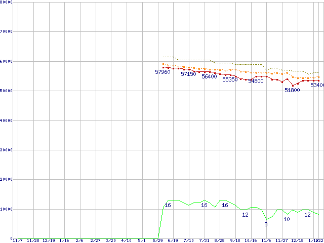Core i7-950 (3.06GHz)の価格推移↑前グラフ↓次グラフ(2008年11月7日〜2010年1月22日)※このグラフは過去のデータも税率5%相当に調整した税込み相当額のグラフです。 税率変更や、総額表示方式導入(2004年4月)の影響は除いています。●関連グラフCPU主要製品の最安値推移CPU主要製品(最安値3万円〜6万円未満)の最安値推移Intel系CPUの最安値推移LGA1366 (QPI 4.8GT/s,L3キャッシュ8MB,Quad Core,Hyper-Threading,TDP 130W)の最安値推移●凡例最安値(点線部は販売店未確認または未調査)平均値最高値ショップ数