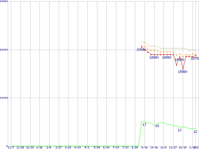 Core i5-750 (2.66GHz)の価格推移↓次グラフ(2008年11月7日〜2010年1月22日)※このグラフは過去のデータも税率5%相当に調整した税込み相当額のグラフです。 税率変更や、総額表示方式導入(2004年4月)の影響は除いています。●関連グラフCPU主要製品の最安値推移CPU主要製品(最安値1万円〜2万円未満)の最安値推移Intel系CPUの最安値推移LGA1156 (L3キャッシュ8MB,Quad Core,TDP 82〜95W)の最安値推移●凡例最安値(点線部は販売店未確認または未調査)平均値最高値ショップ数