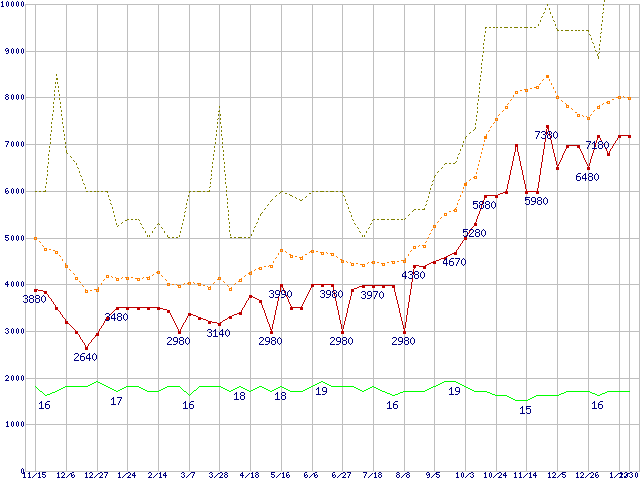 PC2-6400 2GB×2枚組みセットの価格推移↑前グラフ↓次グラフ(2008年11月15日〜2010年1月30日)※このグラフは過去のデータも税率5%相当に調整した税込み相当額のグラフです。 税率変更や、総額表示方式導入(2004年4月)の影響は除いています。●関連グラフメモリ主要製品の最安値推移4GBモジュール/2GBモジュール×2枚の最安値推移メモリ主要製品(最安値5千円〜1万円未満)の最安値推移PC2-6400(DDR2-800) DDR2 SDRAM DIMMの最安値推移PC3-10600/PC2-6400 2GB×2枚組みセットの最安値推移●凡例最安値(点線部は販売店未確認または未調査)平均値最高値ショップ数