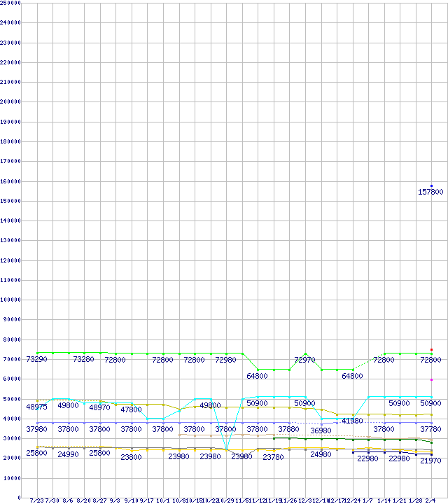 HDD/SSD主要製品(最安値2万円以上)の最安値推移↑前グラフ(2009年7月23日〜2010年2月4日)※このグラフは過去のデータも税率5%相当に調整した税込み相当額のグラフです。 税率変更や、総額表示方式導入(2004年4月)の影響は除いています。凡例2.5インチミドルクラスSSD 512GB (512GB,MLC)2.5インチSSD(SandForce製コントローラ) 100GB (100GB,MLC)SSDSA2SH064G1C5 (64GB,SLC)2.5インチ ミドルクラスSSD 256GB (256GB,MLC)2.5インチ ローエンドSSD 256GB (256GB,MLC)SDSA2MH160G2C1/R1/R5 (160GB,MLC)SSDSA2SH032G1 (32GB,SLC)WD2001FASS (2TB,64MB)ST32000641AS (2TB,64MB)2.5インチ ミドルクラスSSD 128GB (128GB,MLC)WD3000HLFS (300.0GB)SDSA2MH80G2C1/R1/R5 (80GB,MLC)X25-M(G2)OEM品SSD (80GB,MLC)※製品名をクリックすると個別のグラフを表示します※点線部は販売店が確認できなかった、または調査データがないことを示します
