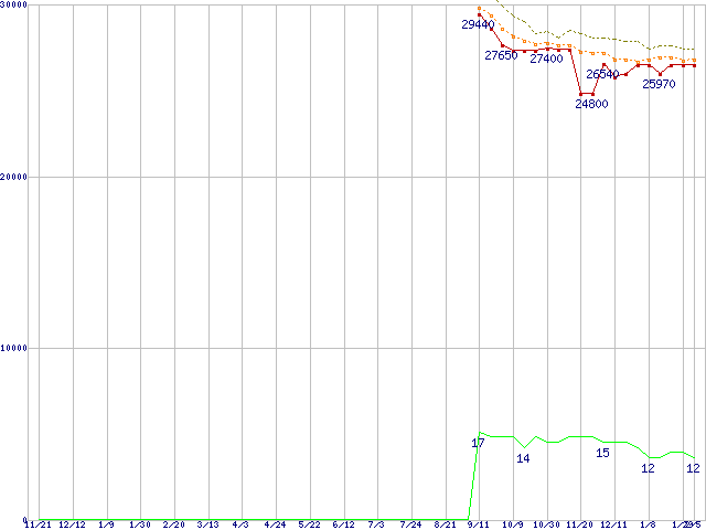 Core i7-860 (2.80GHz)の価格推移↑前グラフ↓次グラフ(2008年11月21日〜2010年2月5日)※このグラフは過去のデータも税率5%相当に調整した税込み相当額のグラフです。 税率変更や、総額表示方式導入(2004年4月)の影響は除いています。●関連グラフCPU主要製品の最安値推移CPU主要製品(最安値2万円〜3万円未満)の最安値推移Intel系CPUの最安値推移LGA1156 (L3キャッシュ8MB,Quad Core,Hyper-Threading,TDP 82〜95W)の最安値推移●凡例最安値(点線部は販売店未確認または未調査)平均値最高値ショップ数