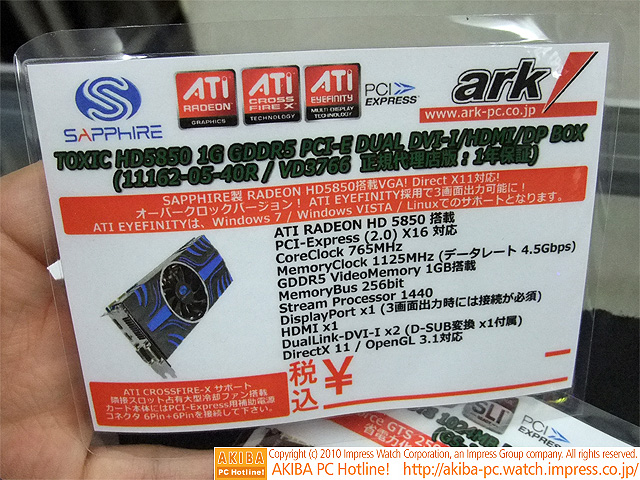 AKIBA PC Hotline! 2010年2月13日号今週見つけた新製品:ビデオカード SAPPHIRE TOXIC HD5850 1G GDDR5 PCI-E DUAL DVI-I/HDMI/DP前の画像←→次の画像