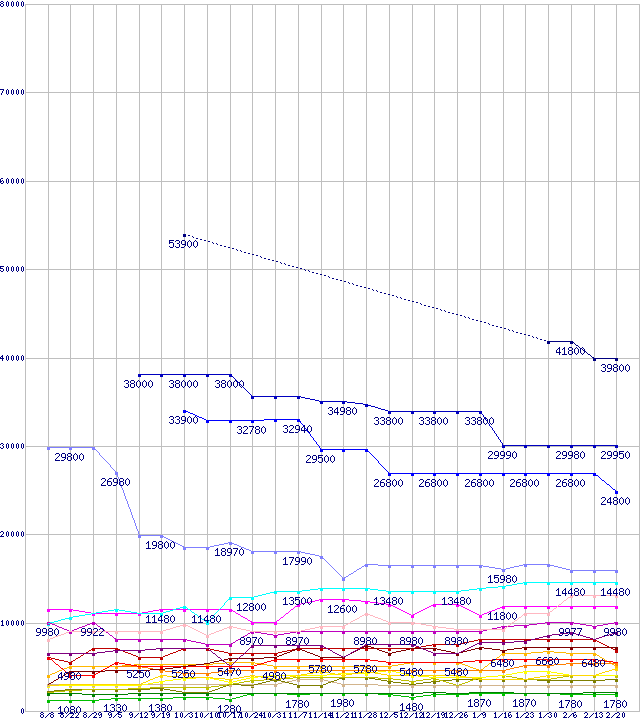メモリ主要製品の最安値推移↑前グラフ↓次グラフ(2009年8月8日〜2010年2月20日)※このグラフは過去のデータも税率5%相当に調整した税込み相当額のグラフです。 税率変更や、総額表示方式導入(2004年4月)の影響は除いています。凡例PC3-12800 4GB×2枚組みセットPC3-10600 4GB×2枚組みセットPC2-6400 4GB×2枚組みセットPC3-10600 4GBPC3-12800 2GB×3枚組みセットPC3-10600 2GB×3枚組みセットPC2-6400 4GBPC3-12800 2GB×2枚組みセットPC3-10600 2GB×2枚組みセットPC2-6400 2GB×2枚組みセットPC3-12800 1GB×3枚組みセットPC3-12800 1GB×2枚組みセットPC3-12800 2GBPC3-10600 1GB×3枚組みセットPC3-10600 1GB×2枚組みセットPC3-10600 2GBPC2-6400 1GB×2枚組みセットPC2-6400 2GBPC3-12800 1GBPC3-10600 1GBPC2-6400 1GB※製品名をクリックすると個別のグラフを表示します※点線部は販売店が確認できなかった、または調査データがないことを示します