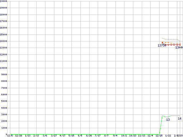 Core i3-540 (3.06GHz)の価格推移↑前グラフ↓次グラフ(2008年12月5日〜2010年2月19日)※このグラフは過去のデータも税率5%相当に調整した税込み相当額のグラフです。 税率変更や、総額表示方式導入(2004年4月)の影響は除いています。●関連グラフCPU主要製品の最安値推移CPU主要製品(最安値1万円〜2万円未満)の最安値推移Intel系CPUの最安値推移LGA1156 (L3キャッシュ4MB,Dual Core,GPU内蔵,Hyper-Threading,TDP 73〜87W)の最安値推移●凡例最安値(点線部は販売店未確認または未調査)平均値最高値ショップ数