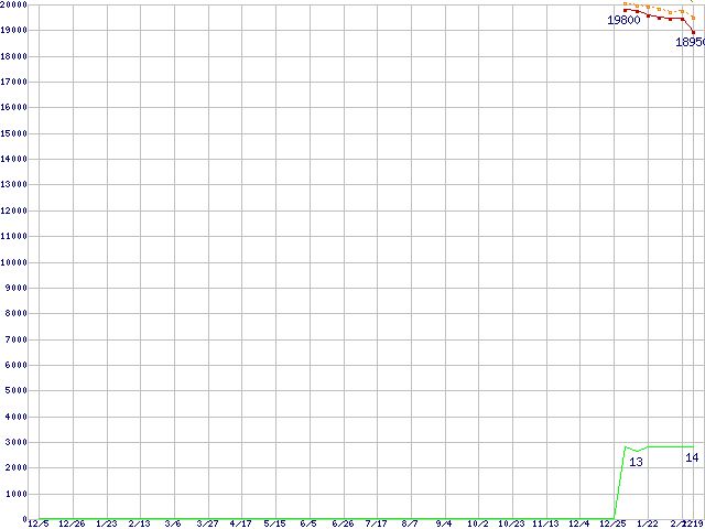 Core i5-660 (3.33GHz)の価格推移↑前グラフ↓次グラフ(2008年12月5日〜2010年2月19日)※このグラフは過去のデータも税率5%相当に調整した税込み相当額のグラフです。 税率変更や、総額表示方式導入(2004年4月)の影響は除いています。●関連グラフCPU主要製品の最安値推移CPU主要製品(最安値1万円〜2万円未満)の最安値推移Intel系CPUの最安値推移LGA1156 (L3キャッシュ4MB,Dual Core,GPU内蔵,Hyper-Threading,TDP 73〜87W)の最安値推移●凡例最安値(点線部は販売店未確認または未調査)平均値最高値ショップ数