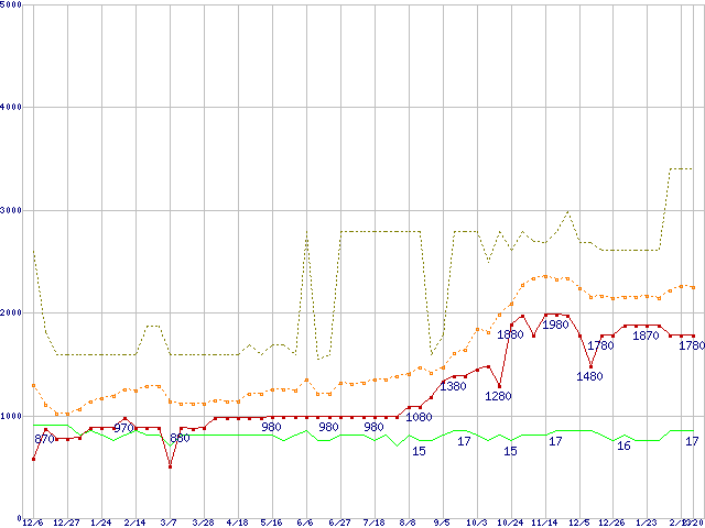 PC2-6400 1GBの価格推移↑前グラフ↓次グラフ(2008年12月6日〜2010年2月20日)※このグラフは過去のデータも税率5%相当に調整した税込み相当額のグラフです。 税率変更や、総額表示方式導入(2004年4月)の影響は除いています。●関連グラフメモリ主要製品の最安値推移1GBモジュールの最安値推移メモリ主要製品(最安値5千円未満)の最安値推移PC2-6400(DDR2-800) DDR2 SDRAM DIMMの最安値推移●凡例最安値(点線部は販売店未確認または未調査)平均値最高値ショップ数