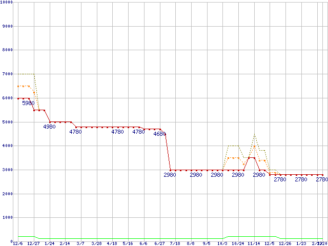 PC3-12800 1GBの価格推移↑前グラフ↓次グラフ(2008年12月6日〜2010年2月20日)※このグラフは過去のデータも税率5%相当に調整した税込み相当額のグラフです。 税率変更や、総額表示方式導入(2004年4月)の影響は除いています。●関連グラフメモリ主要製品の最安値推移1GBモジュールの最安値推移メモリ主要製品(最安値5千円未満)の最安値推移PC3-12800(DDR3-1600) DDR3 SDRAM DIMMの最安値推移●凡例最安値(点線部は販売店未確認または未調査)平均値最高値ショップ数