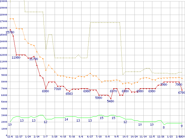 PC3-12800 1GB×3枚組みセットの価格推移↑前グラフ↓次グラフ(2008年12月6日〜2010年2月20日)※このグラフは過去のデータも税率5%相当に調整した税込み相当額のグラフです。 税率変更や、総額表示方式導入(2004年4月)の影響は除いています。●関連グラフメモリ主要製品の最安値推移メモリ主要製品(最安値5千円〜1万円未満)の最安値推移PC3-12800(DDR3-1600) DDR3 SDRAM DIMMの最安値推移●凡例最安値(点線部は販売店未確認または未調査)平均値最高値ショップ数