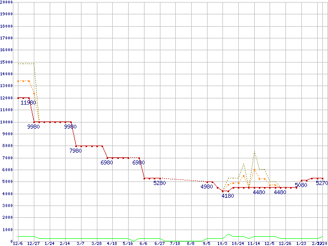 PC3-12800 2GBの価格推移↑前グラフ↓次グラフ(2008年12月6日〜2010年2月20日)※このグラフは過去のデータも税率5%相当に調整した税込み相当額のグラフです。 税率変更や、総額表示方式導入(2004年4月)の影響は除いています。●関連グラフメモリ主要製品の最安値推移2GBモジュール/1GBモジュール×2枚の最安値推移メモリ主要製品(最安値5千円〜1万円未満)の最安値推移PC3-12800(DDR3-1600) DDR3 SDRAM DIMMの最安値推移●凡例最安値(点線部は販売店未確認または未調査)平均値最高値ショップ数