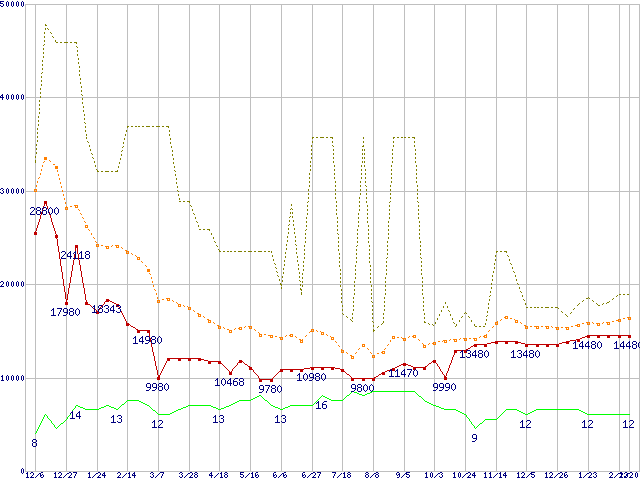 PC3-12800 2GB×3枚組みセットの価格推移↑前グラフ↓次グラフ(2008年12月6日〜2010年2月20日)※このグラフは過去のデータも税率5%相当に調整した税込み相当額のグラフです。 税率変更や、総額表示方式導入(2004年4月)の影響は除いています。●関連グラフメモリ主要製品の最安値推移メモリ主要製品(最安値1万円以上)の最安値推移PC3-12800(DDR3-1600) DDR3 SDRAM DIMMの最安値推移●凡例最安値(点線部は販売店未確認または未調査)平均値最高値ショップ数