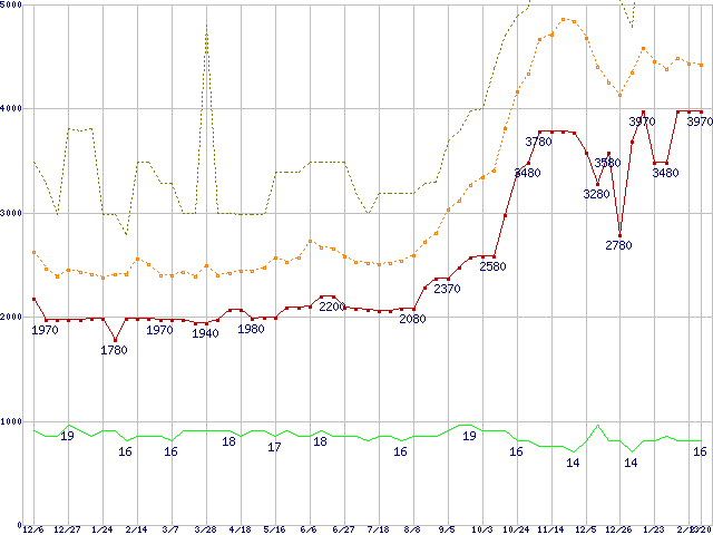PC2-6400 1GB×2枚組みセットの価格推移↑前グラフ↓次グラフ(2008年12月6日〜2010年2月20日)※このグラフは過去のデータも税率5%相当に調整した税込み相当額のグラフです。 税率変更や、総額表示方式導入(2004年4月)の影響は除いています。●関連グラフメモリ主要製品の最安値推移2GBモジュール/1GBモジュール×2枚の最安値推移メモリ主要製品(最安値5千円未満)の最安値推移PC2-6400(DDR2-800) DDR2 SDRAM DIMMの最安値推移●凡例最安値(点線部は販売店未確認または未調査)平均値最高値ショップ数