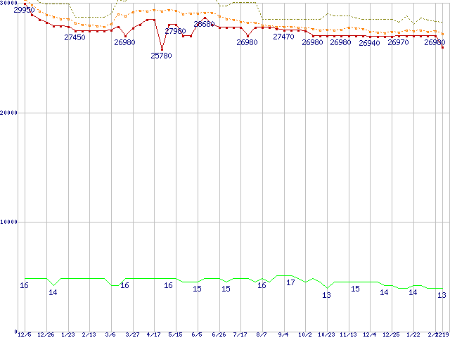 Core i7-920 (2.66GHz)の価格推移↑前グラフ↓次グラフ(2008年12月5日〜2010年2月19日)※このグラフは過去のデータも税率5%相当に調整した税込み相当額のグラフです。 税率変更や、総額表示方式導入(2004年4月)の影響は除いています。●関連グラフCPU主要製品の最安値推移CPU主要製品(最安値2万円〜3万円未満)の最安値推移Intel系CPUの最安値推移LGA1366 (QPI 4.8GT/s,L3キャッシュ8MB,Quad Core,Hyper-Threading,TDP 130W)の最安値推移●凡例最安値(点線部は販売店未確認または未調査)平均値最高値ショップ数