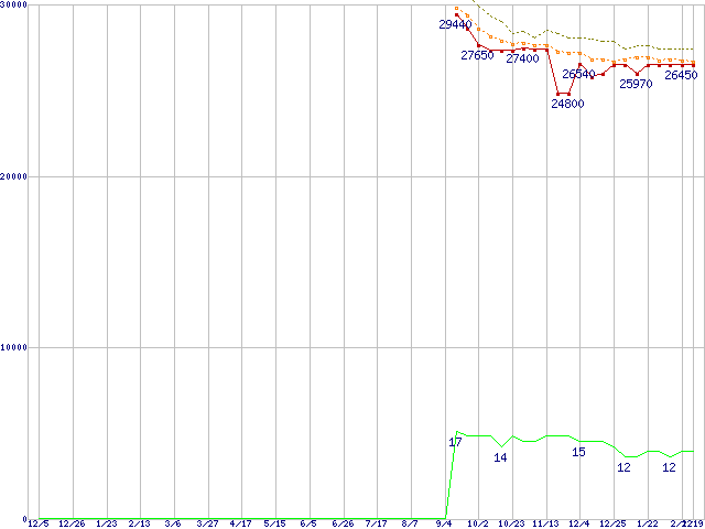 Core i7-860 (2.80GHz)の価格推移↑前グラフ↓次グラフ(2008年12月5日〜2010年2月19日)※このグラフは過去のデータも税率5%相当に調整した税込み相当額のグラフです。 税率変更や、総額表示方式導入(2004年4月)の影響は除いています。●関連グラフCPU主要製品の最安値推移CPU主要製品(最安値2万円〜3万円未満)の最安値推移Intel系CPUの最安値推移LGA1156 (L3キャッシュ8MB,Quad Core,Hyper-Threading,TDP 82〜95W)の最安値推移●凡例最安値(点線部は販売店未確認または未調査)平均値最高値ショップ数