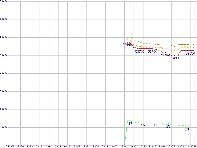 Core i7-870 (2.93GHz)の価格推移↑前グラフ↓次グラフ(2008年12月5日〜2010年2月19日)※このグラフは過去のデータも税率5%相当に調整した税込み相当額のグラフです。 税率変更や、総額表示方式導入(2004年4月)の影響は除いています。●関連グラフCPU主要製品の最安値推移CPU主要製品(最安値3万円〜6万円未満)の最安値推移Intel系CPUの最安値推移LGA1156 (L3キャッシュ8MB,Quad Core,Hyper-Threading,TDP 82〜95W)の最安値推移●凡例最安値(点線部は販売店未確認または未調査)平均値最高値ショップ数